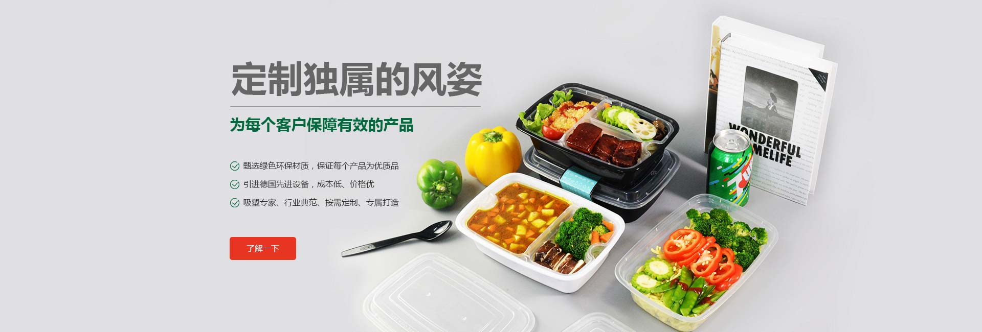 公司拥有先进生产设备,都是进口设备,生产工艺精良,环保安全,出产更高效迅速,能满足快消品行业餐盒的需求,选择我们为您一条龙服务,我们将为您保驾护航!